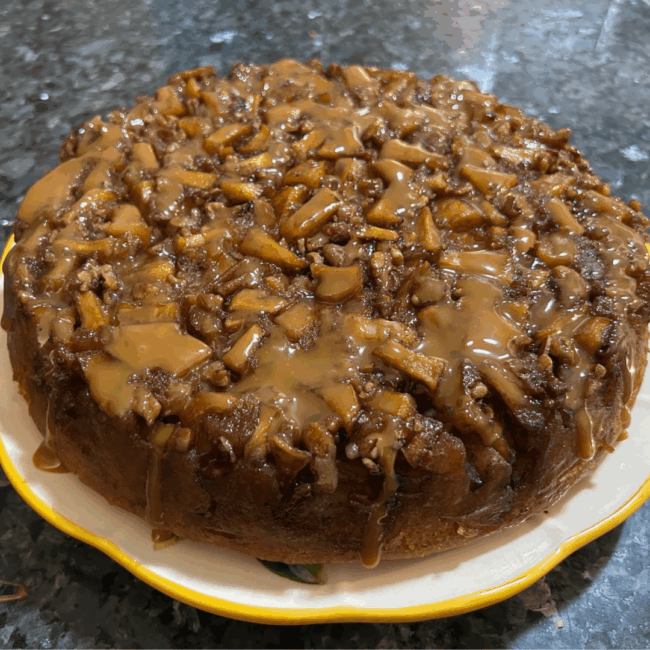This easy Apple Upside-Down Cake starts with a white cake mix and bakes up beautifully in a cast iron skillet or a regular pan. Warm, caramelized, and delicious!