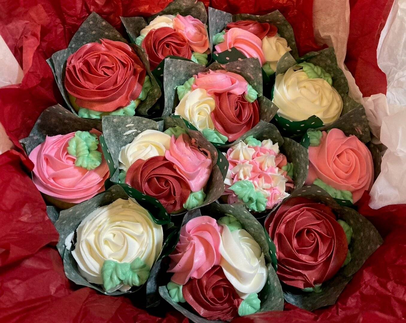 Now step back and admire your handiwork! Check out those buttercream roses. Lovely! They almost looks like a real flower bouquet tucked into that white and red tissue paper!