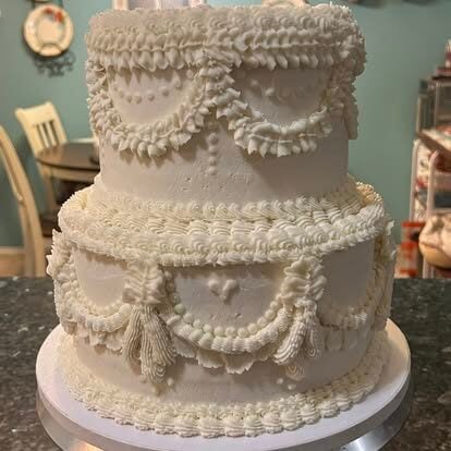 This is a great white-on-white technique that is pretty much foolproof. It also involves piping, but a truly simplistic style that's great for beginners. Some people call it Chantilly lace. I just call it abstract scrolling.