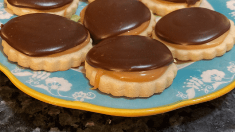 Caramel and chocolate sit on top of a yummy shortbread cookie. The family will love these!