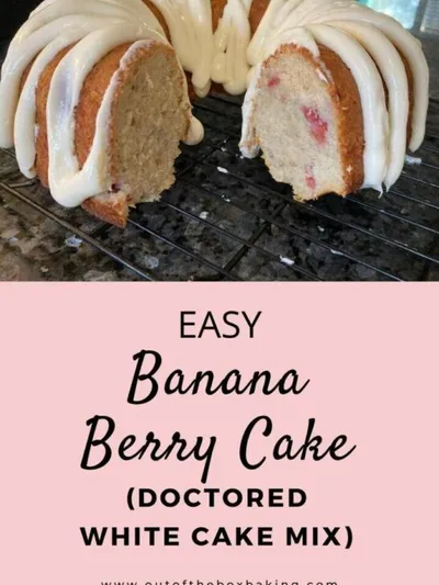 Easy Banana Berry Cake: This Easy Banana Berry Cake is light, fluffy, and filled with the creaminess of bananas and tartness of raspberries. The addition of the luscious cream cheese drip sends it over the edge, to a whole new place! Best of all, this recipe starts with a boxed cake mix!