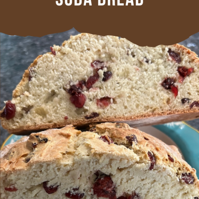 Unlike yeasted breads, soda breads are more dense in texture. They have a southern biscuit feel about them. This one has a bit of added sweetness, thanks to the Craisins, which makes it perfect! Slice and serve with butter or jam or both.