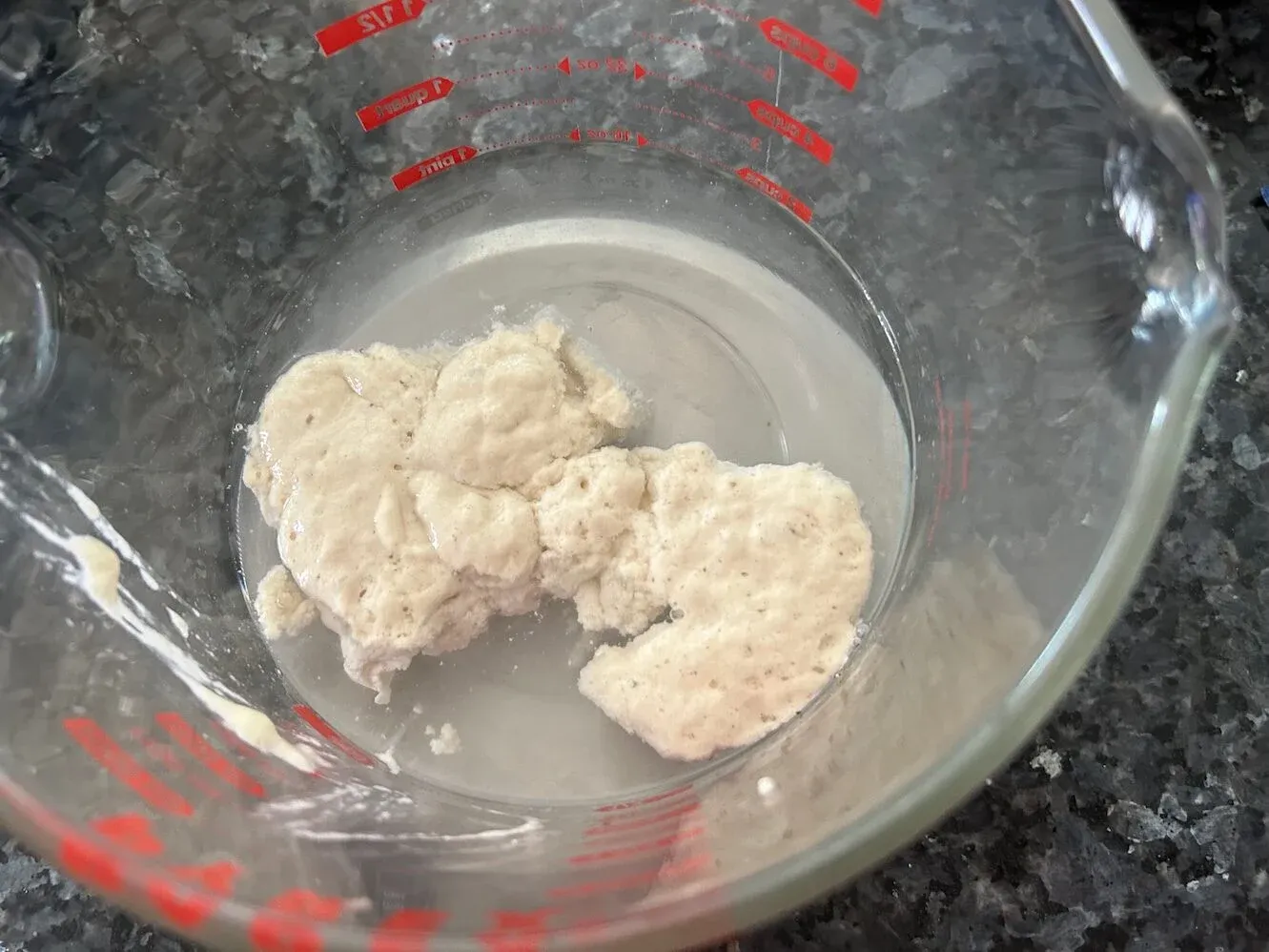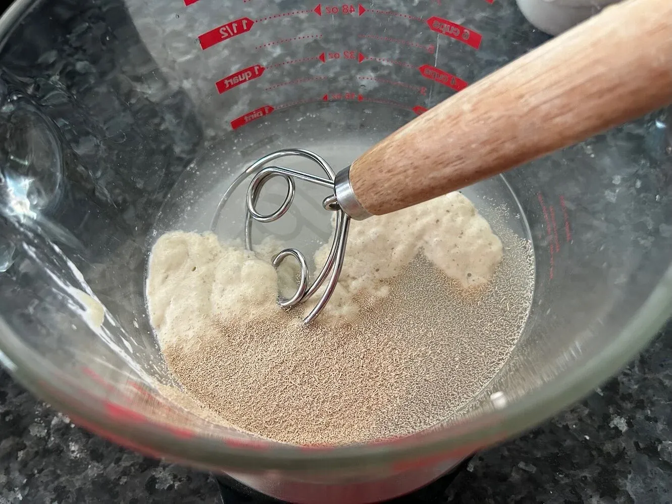 Combine water, starter, and instant yeast in a large bowl using a bread whisk or blending fork. Mix until the starter breaks down.