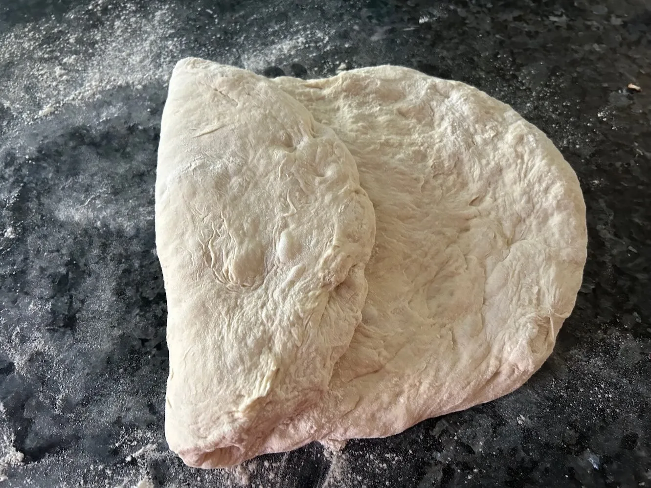 After the thirty minutes is up, do three rounds of stretch and folds with the dough, 20 minutes apart.