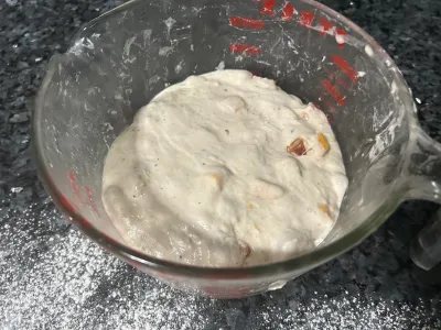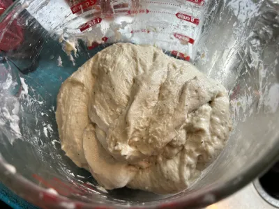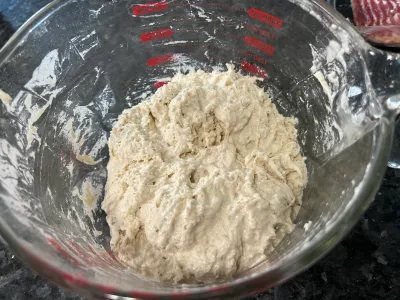 Use the bread whisk to create a shaggy dough. It’s going to be sticky, but that’s what you want.