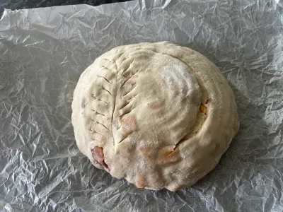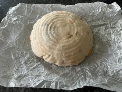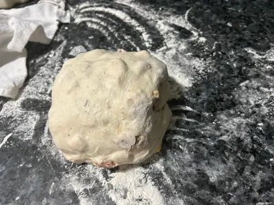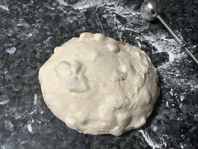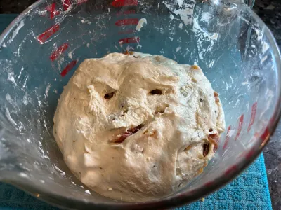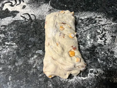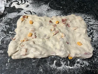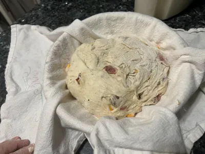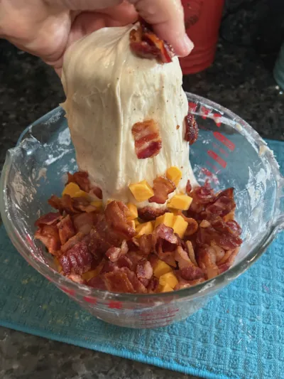 Perform your second stretch and folds. This is the time to add your bacon and cheese to the dough. (The next time I make this bread I’ll probably lightly toss the bacon pieces in flour before adding them.) Work it in as best you can. Cover, and set aside.