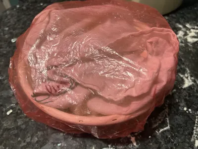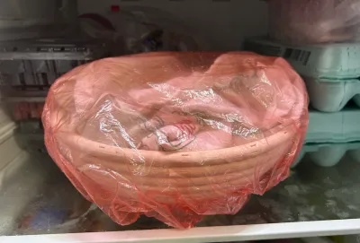 Set the loaf inside (flipping over to put the smooth side down). Cover with tea towel or cheesecloth and set in refrigerator to rest overnight.