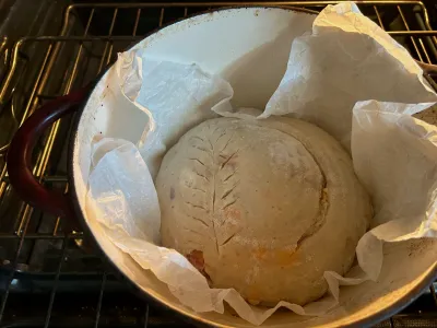 Remove the dutch oven from the oven and lift the bread (parchment paper and all) out.