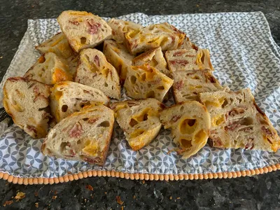 - Cheddar brings a lovely creaminess and causes pockets of gooey texture. This works because it balances out the tang of the sourdough and the saltiness of the bacon.