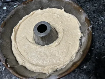 - Prep a bundt pan with Baker’s Joy (or grease and flour)