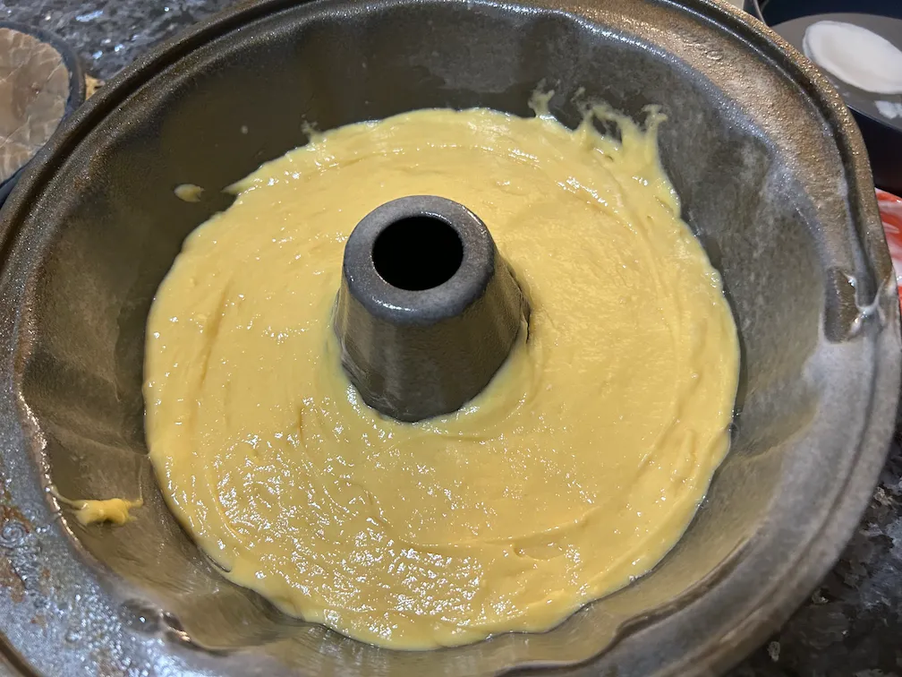 - Prepare a bundt pan with Baker’s joy (or with shortening and flour)