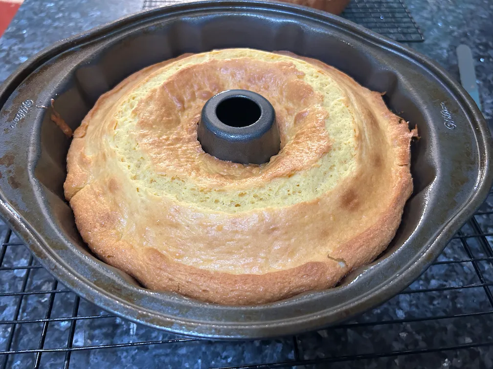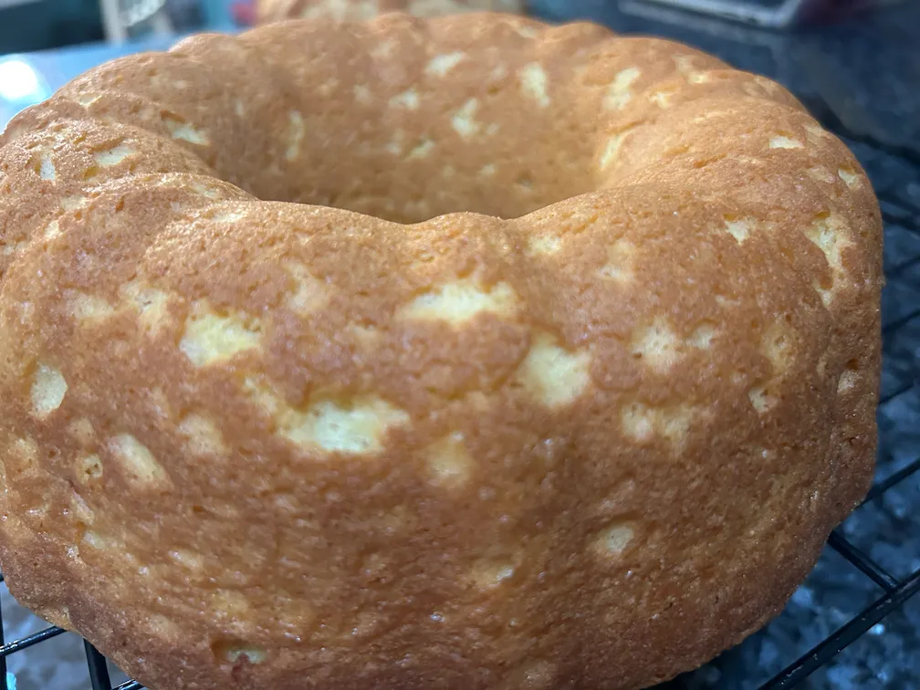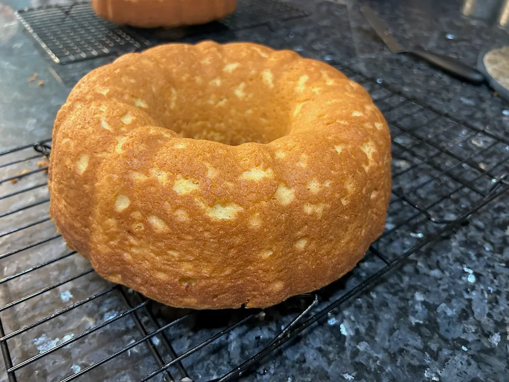 Prepare a bundt pan with Baker’s joy (or with shortening and flour)