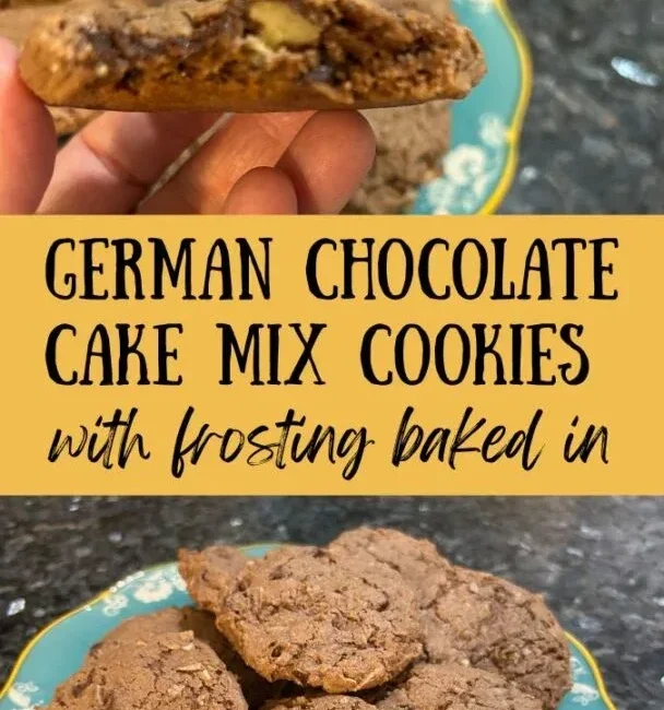Some time ago a friend  reached out to tell me about a different kind of German Chocolate Cake (a bundt made with a can of coconut pecan frosting baked in). I loved it so much that I decided to take that same basic concept and turn it into a cake mix cookie.
