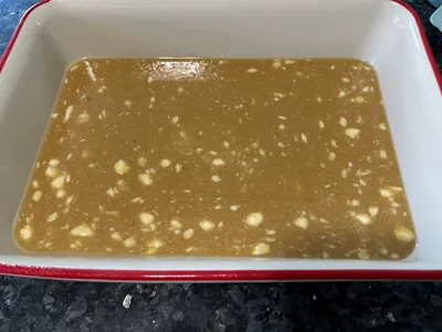 Pour the gooey mixture into the prepared baking dish.