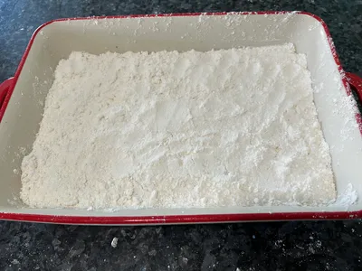 Sprinkle the reserved ¼ cup of cake mix evenly over the top — this helps absorb excess moisture in baking.