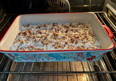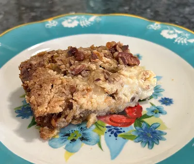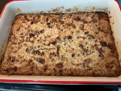 Let it cool at room temperature for 30-45 minutes before slicing. This allows the gooey layer to firm up like pecan pie filling.