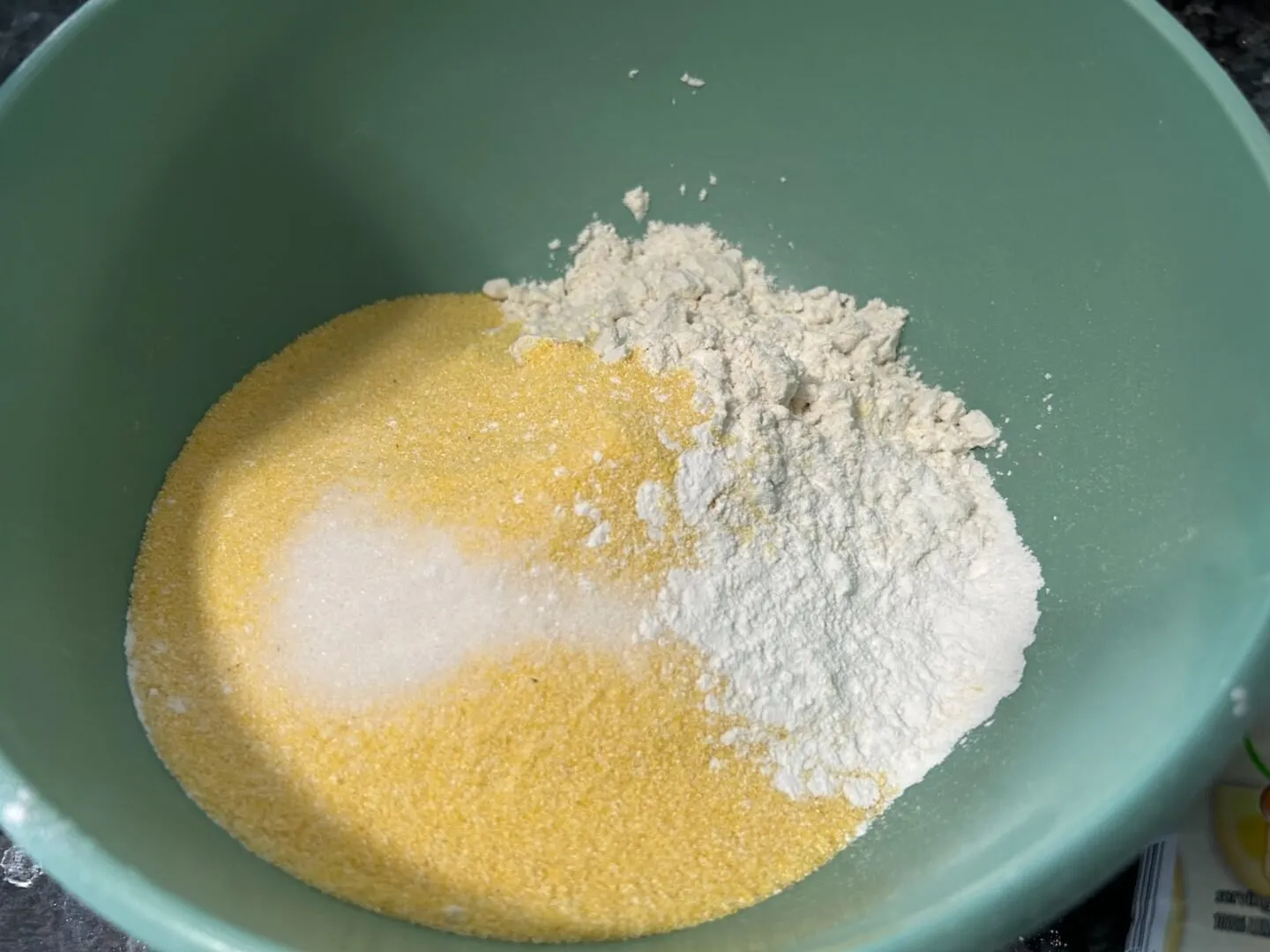 - Combine dry ingredients: In a large bowl, whisk together cornmeal, flour, baking powder, salt, and sugar.