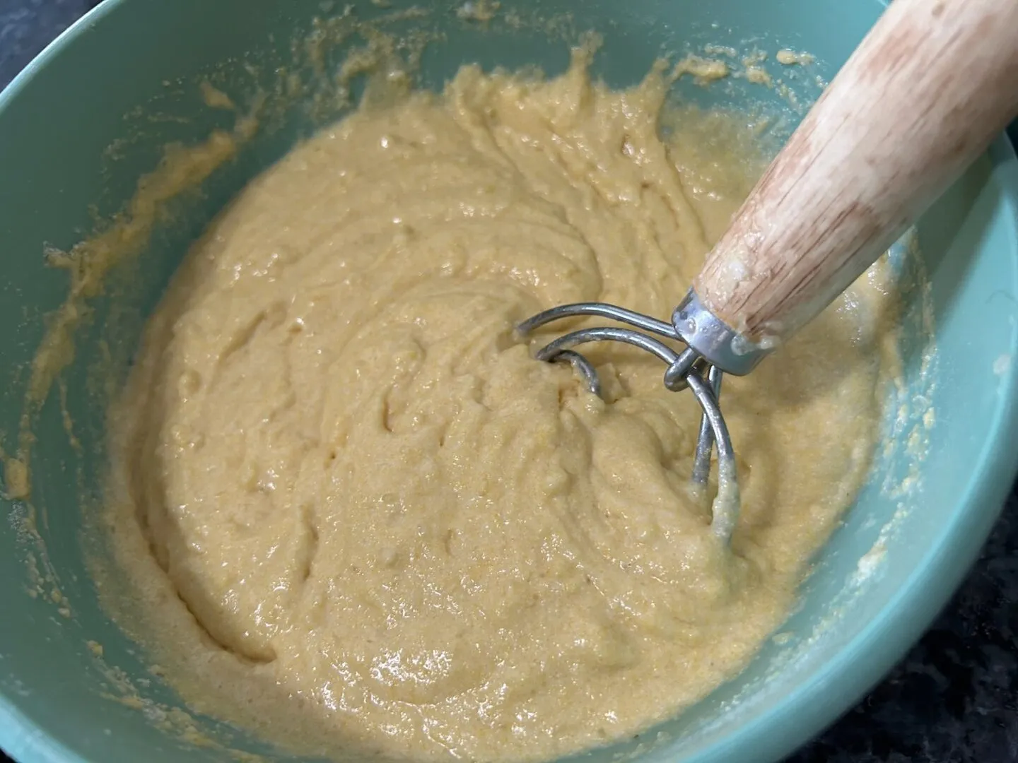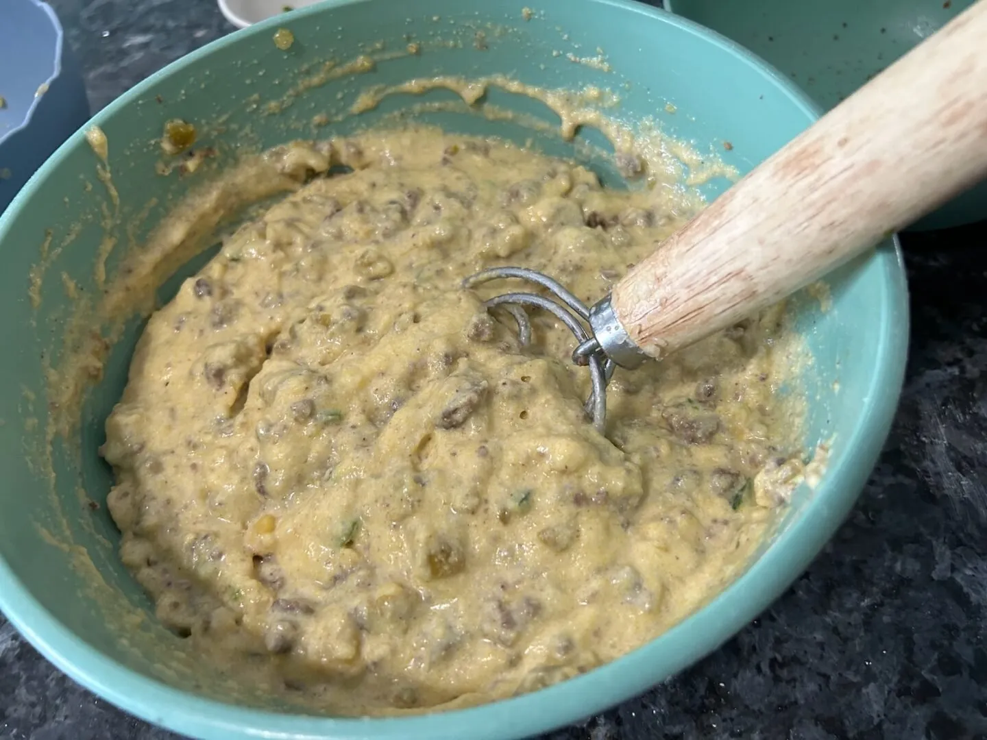 Gently fold in crumbled sausage, mashed corn, green chiles, jalapeño (if using), and cheese until evenly distributed. Batter should be thick but scoopable.