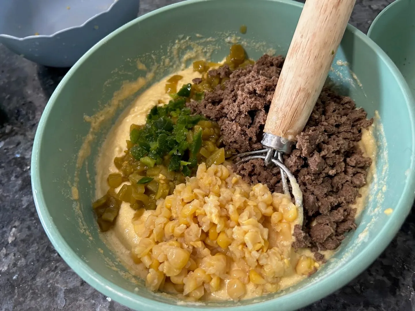 - Add mix-ins: Gently fold in crumbled sausage, mashed corn, green chiles, jalapeño (if using), and cheese until evenly distributed. Batter should be thick but scoopable. If it feels too thick, add 1–2 tablespoons of buttermilk. If it’s too loose, stir in a bit more cornmeal.