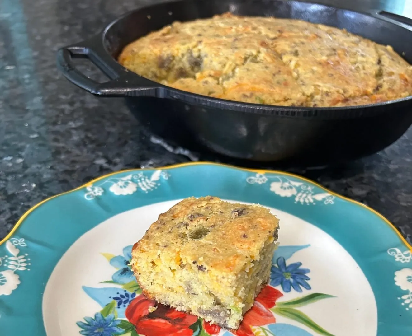 We're especially fond of spicing up our cornbread, and that's just what I've done for you today. I took a simple skillet cornbread and turned it into a savory one. And then, just for fun, I added spice and sausage to give it a real kick.