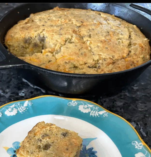 This cornbread is tender yet sturdy, with crispy edges and a flavorful, hearty middle. The sausage brings smoky depth, the green chiles add gentle warmth, and the mashed corn keeps everything beautifully moist. Sliceable, soul-satisfying cornbread that holds together from pan to plate.