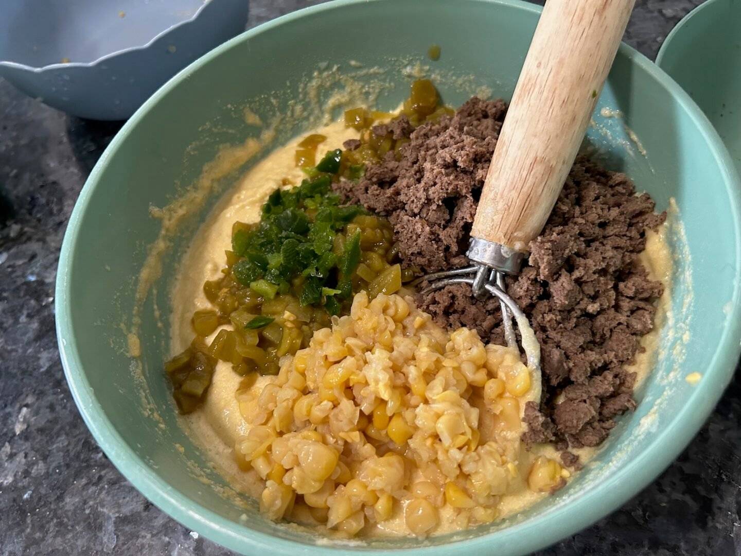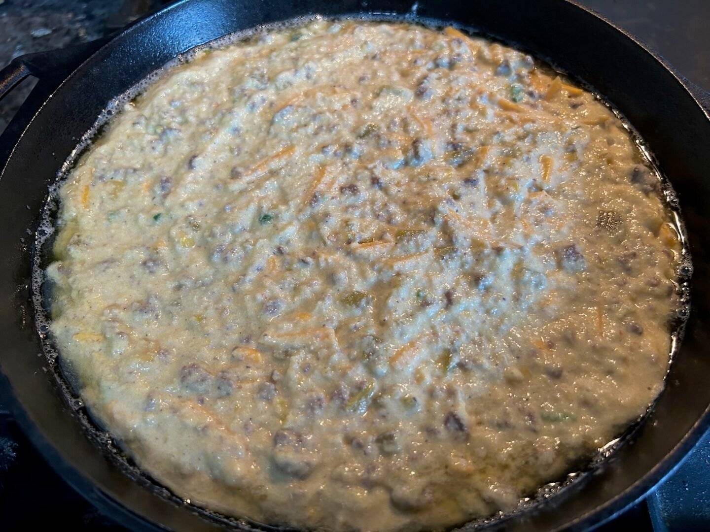 Gently fold in crumbled sausage, mashed corn, green chiles, jalapeño (if using), and cheese until evenly distributed. Batter should be thick but scoopable.
