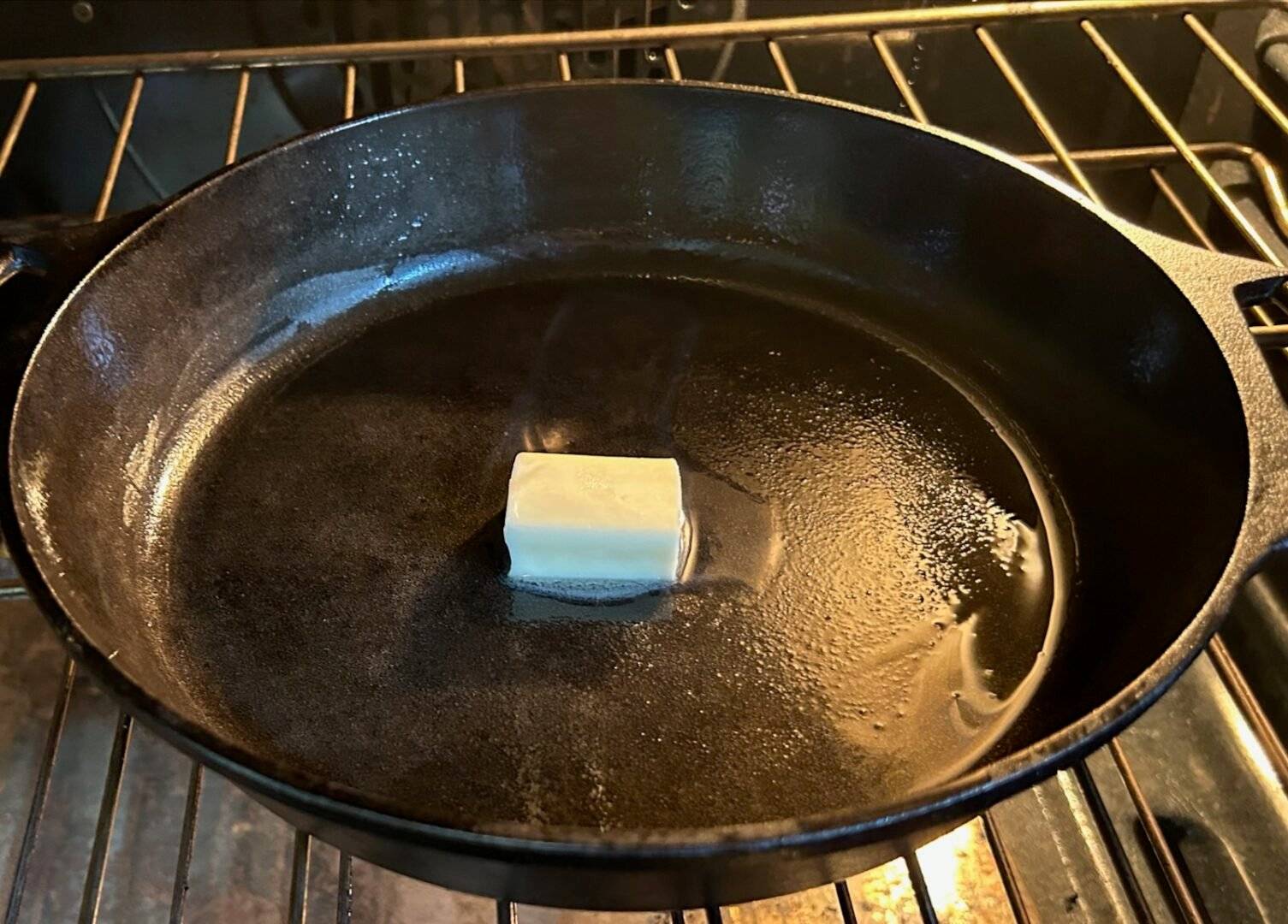 Remove the hot skillet from the oven and add 1 tablespoon butter, swirling to coat the bottom and sides. The butter should sizzle and brown slightly.