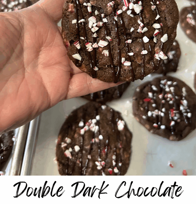 That's how I landed on this double dark chocolate peppermint idea. I found a bag of crushed peppermint at the grocery store and my mind started reeling. I knew that my Double Dark Chocolate Cherry cookies were a personal favorite, but could I take that same dark chocolate base and use crushed peppermints in place of the cherries?
