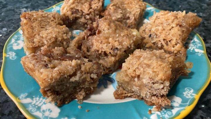 If you love coconut pecan cake but you’re looking for something with more of a bar or cookie texture you’ve definitely come to the right place! This is one of my simplest (but tastiest) recipes yet. And it starts with canned frosting and a box of white cake mix!
