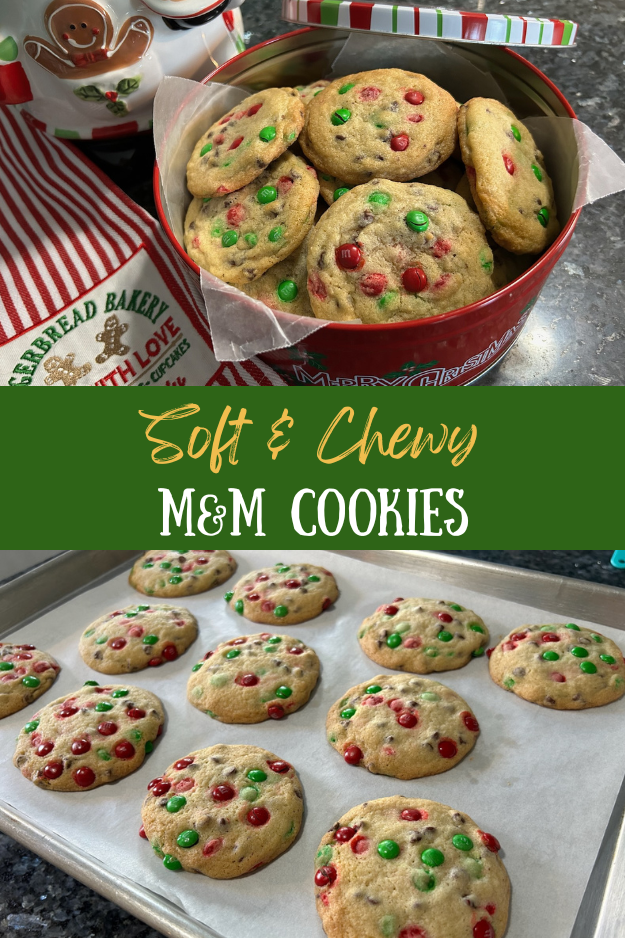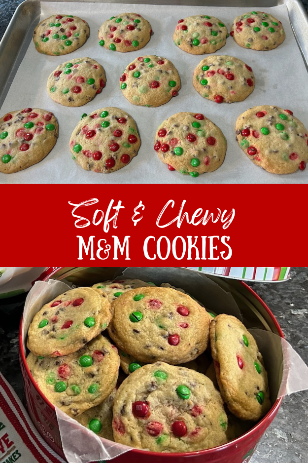 Soft and chewy M&M cookies made with mini chocolate chips and festive candies. A quick, easy cookie everyone loves!