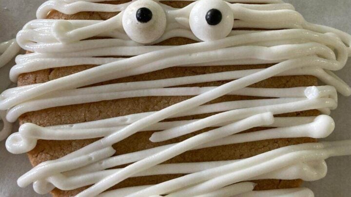 Soft cookies wrapped in sweet “icing bandages” and decorated with cute eyes make these mummy cookies a fun, playful treat for Halloween parties and kid-friendly bake days.