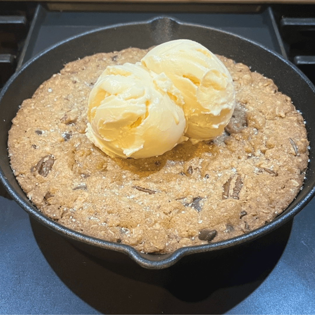 This warm, gooey skillet cookie is baked right on the grill for a fun twist on dessert. Serve it warm in wedges with ice cream for the ultimate game day treat.