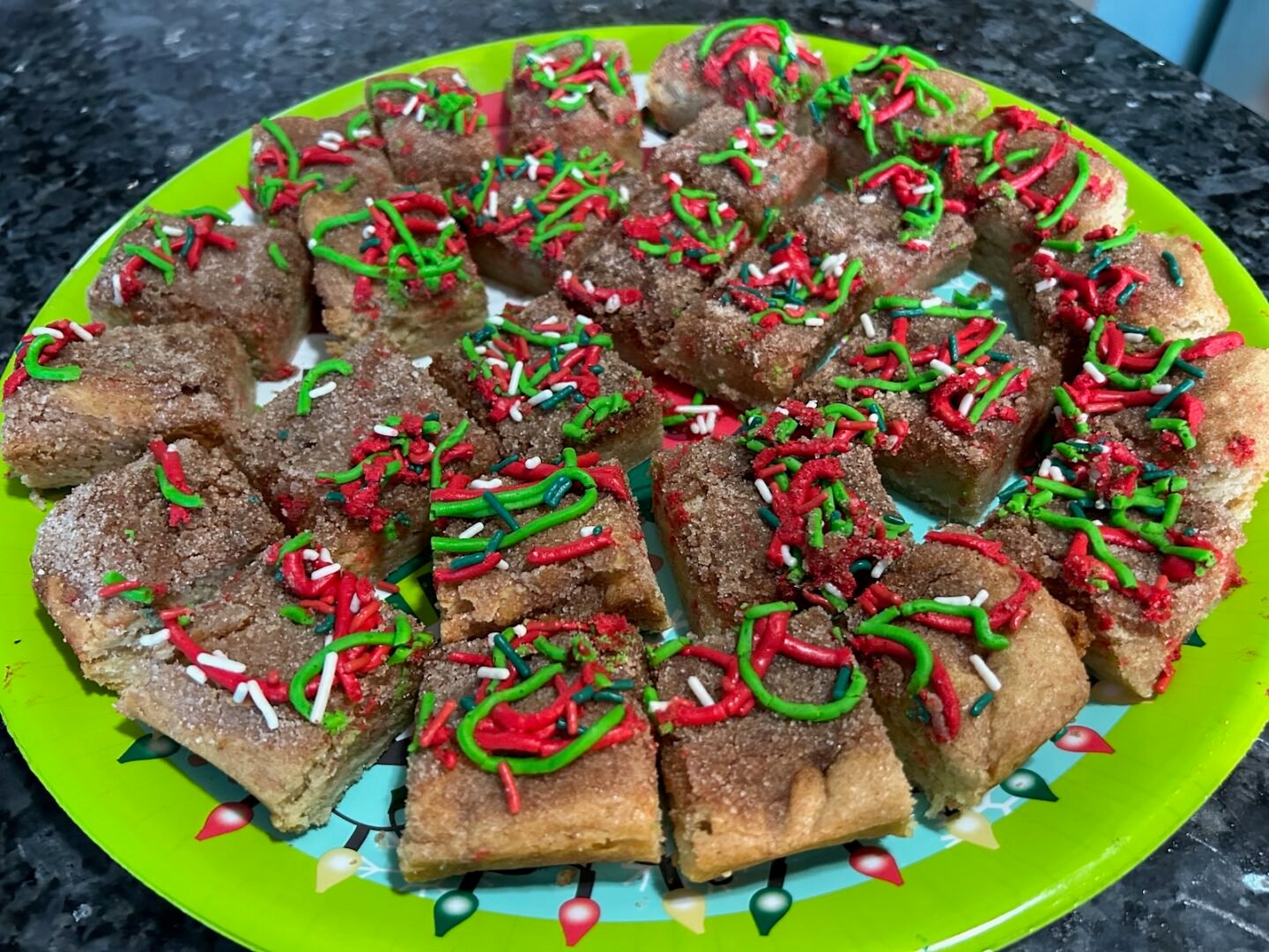 These soft, buttery snickerdoodle bars (my most requested holiday treat this year!) were topped with festive red and green icing for a bold Grinch-inspired look. The cinnamon-sugar base gives them classic holiday flavor, while the colorful icing makes them party-ready.