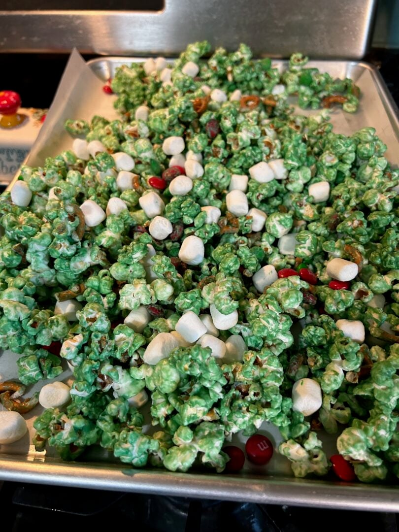 This Grinch popcorn might be the easiest treat in the whole roundup—and it disappears FAST. I whipped it up in just a few minutes, then let it dry and put ¾ cup in individual treat bags for the kiddos.