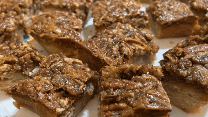 Buttery snickerdoodle cookie bars topped with a gooey, maple-sweet pecan pie filling — the best of two classic desserts in one easy bar.