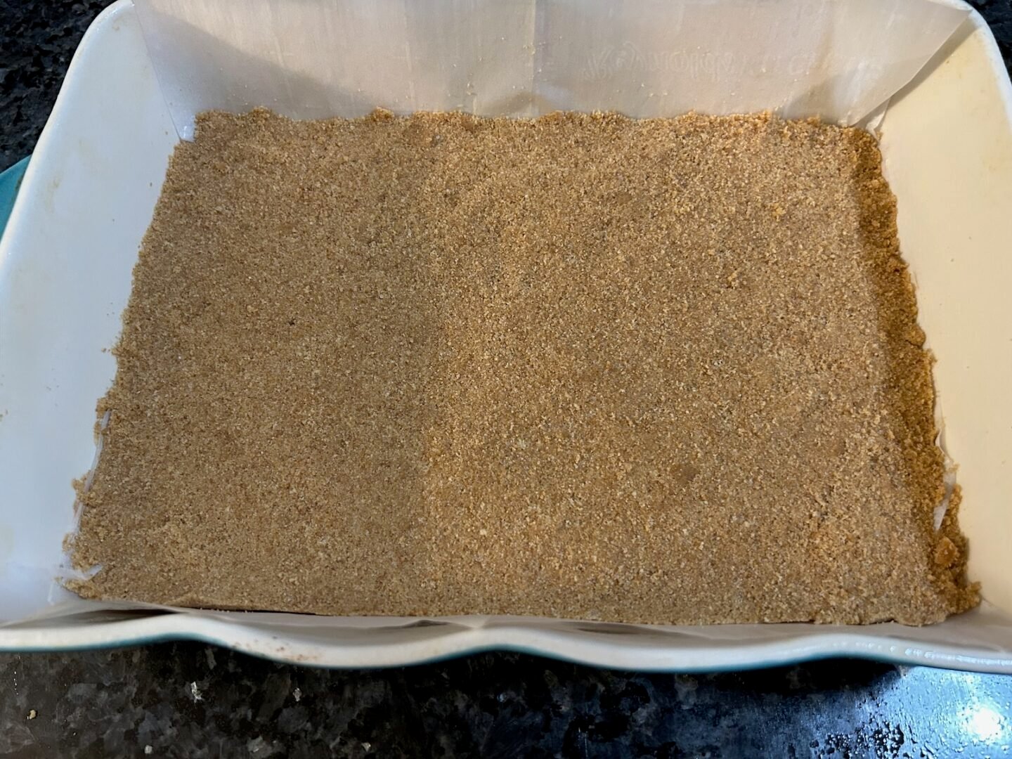 Press firmly into the bottom of the pan, packing it down tightly with the bottom of a measuring cup.
