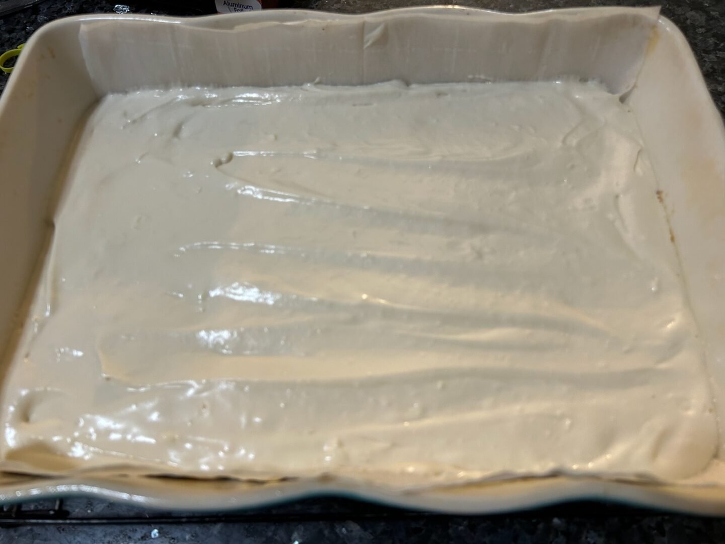Line a 9×13-inch baking pan with parchment paper, leaving overhang on the sides for easy removal later.