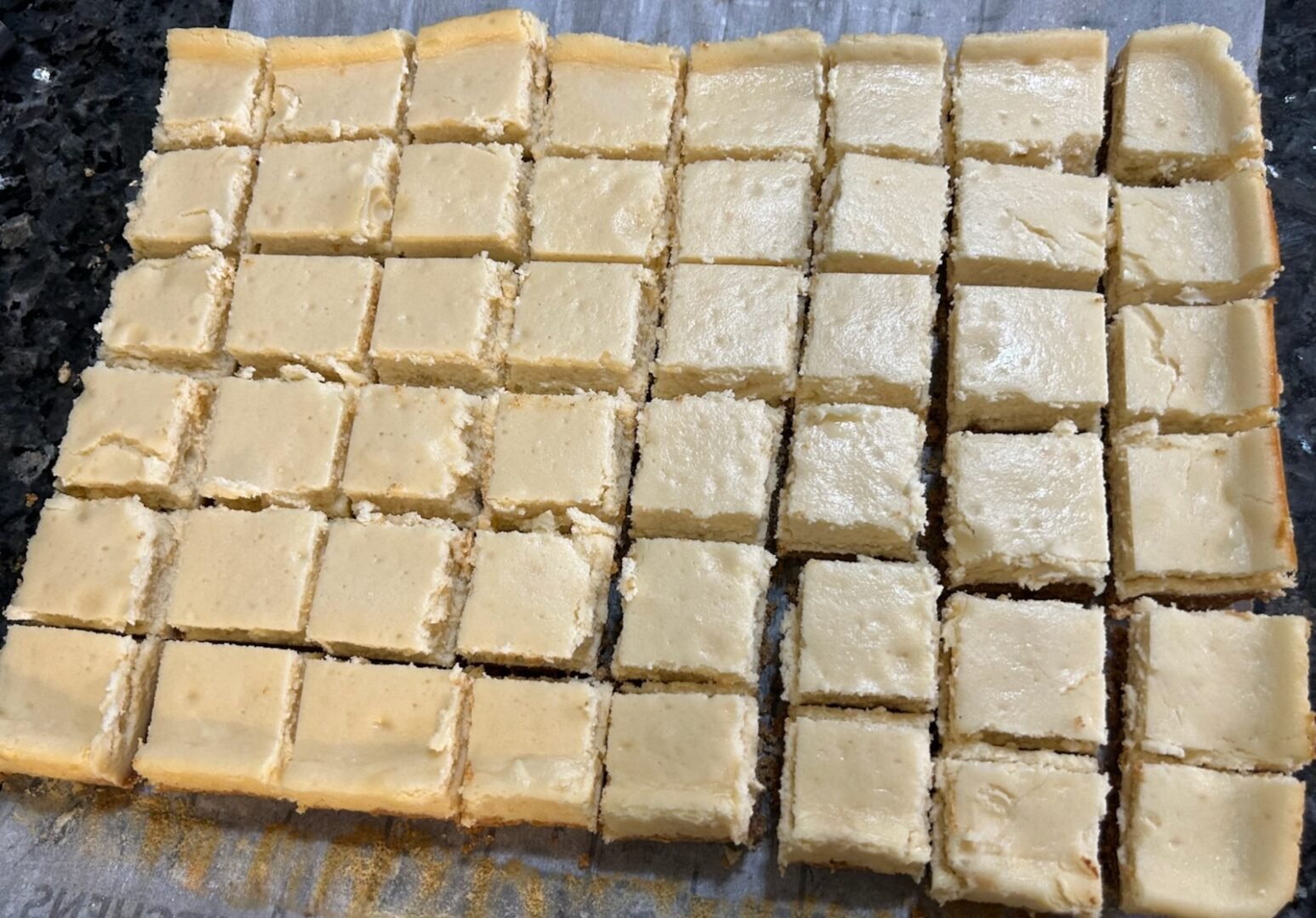 This (simple!) recipe was developed specifically to be cut cleanly into small squares — no sagging, no icky edges, just smooth, creamy cheesecake with a bakery-style finish.