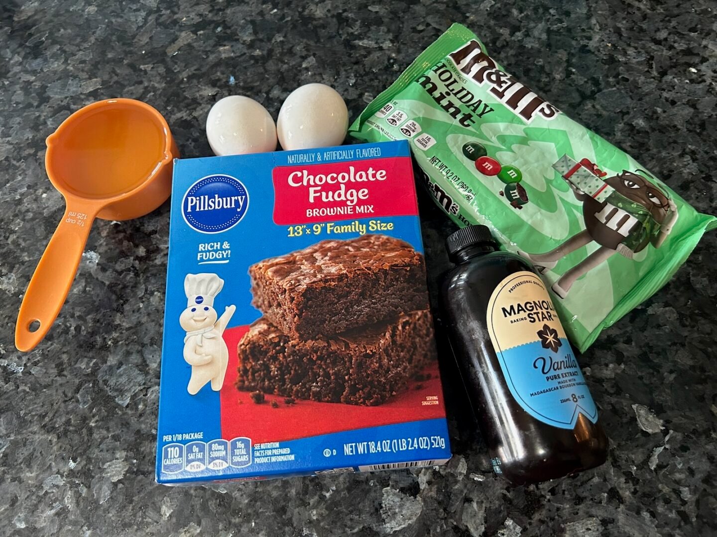- 1–1¼ cups mini mint M&Ms (reserve a few for pressing on top before baking)