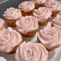 Make the frosting by beating the room temperature butter, then adding the powdered sugar, milk (to get to desired consistency), vanilla, and pinch of salt (unless you use salted butter).