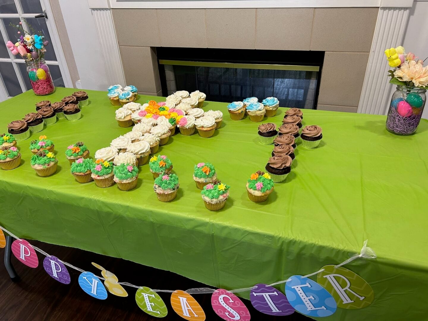 Resurrection cupcake display on table with green tablecloth