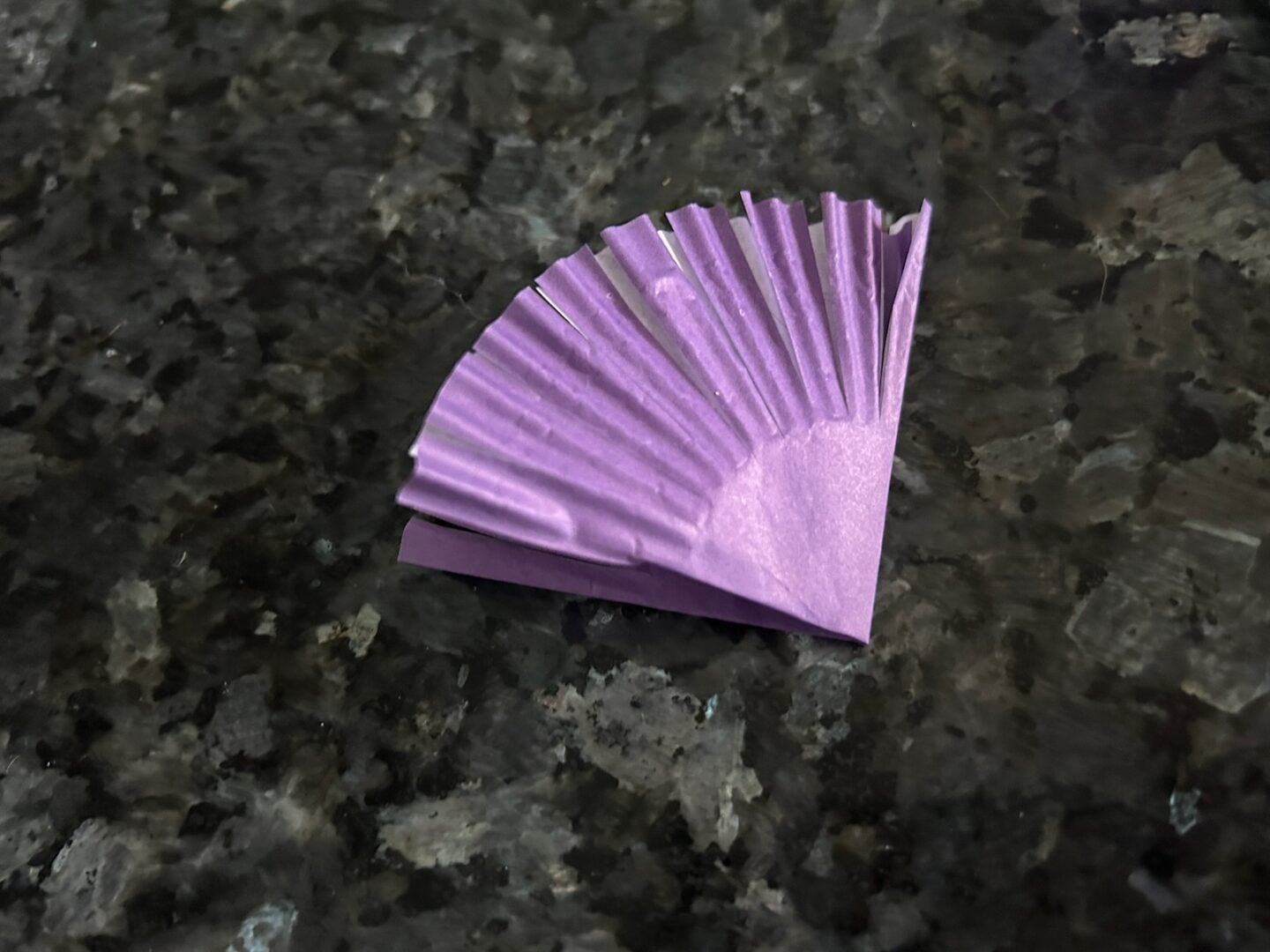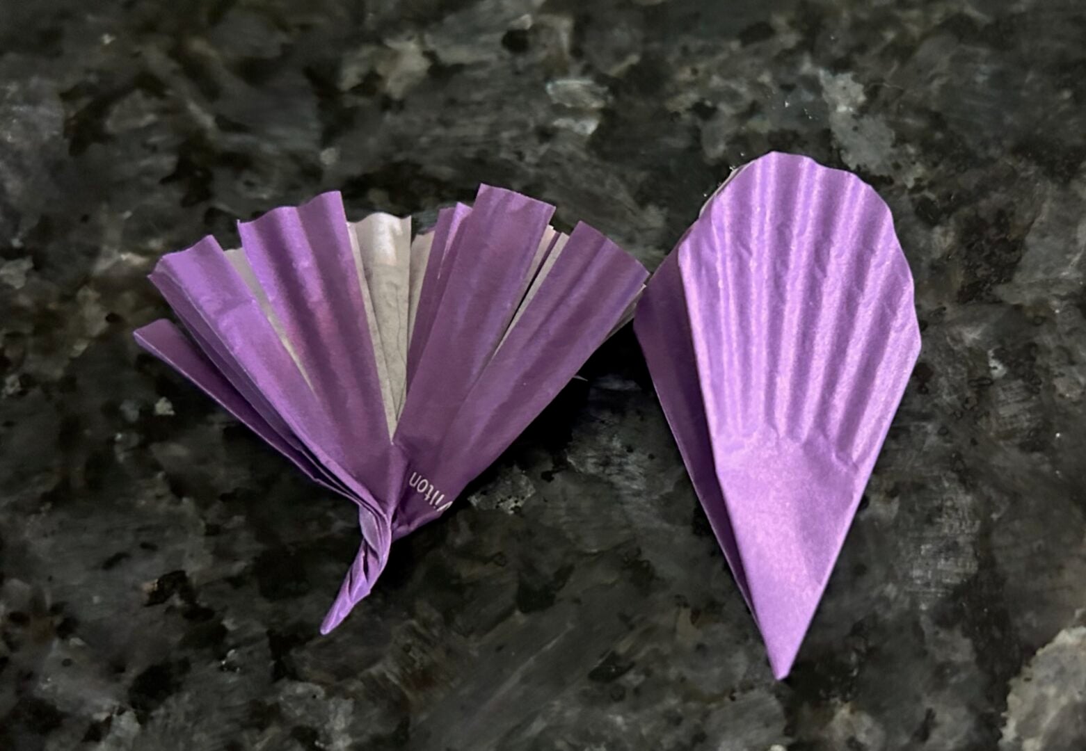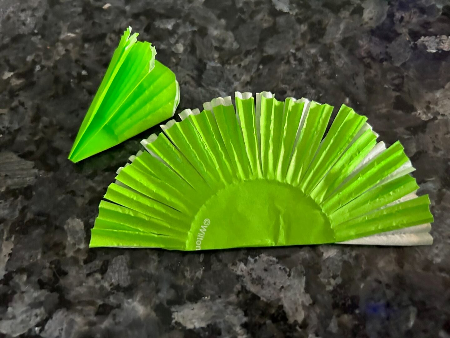Flatten a cupcake liner and gently press it open. Fold it in half (inner side touching inner side). Now fold it again, this time into a triangle. Now fold it once more, making an even smaller triangle.