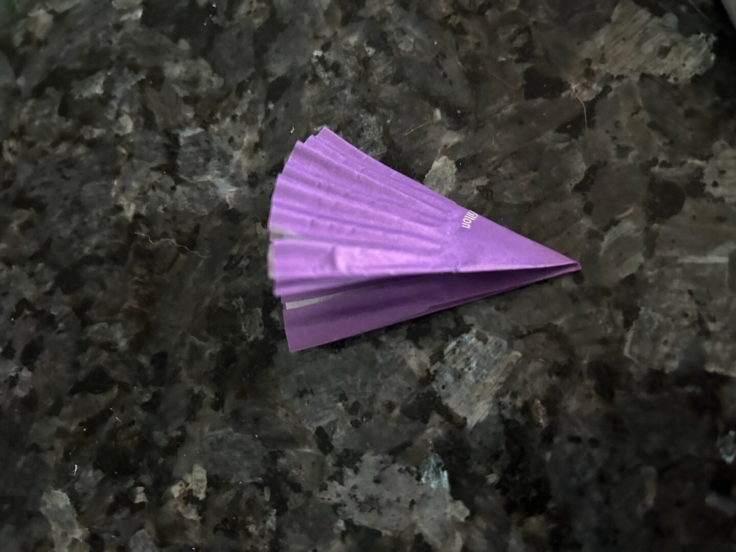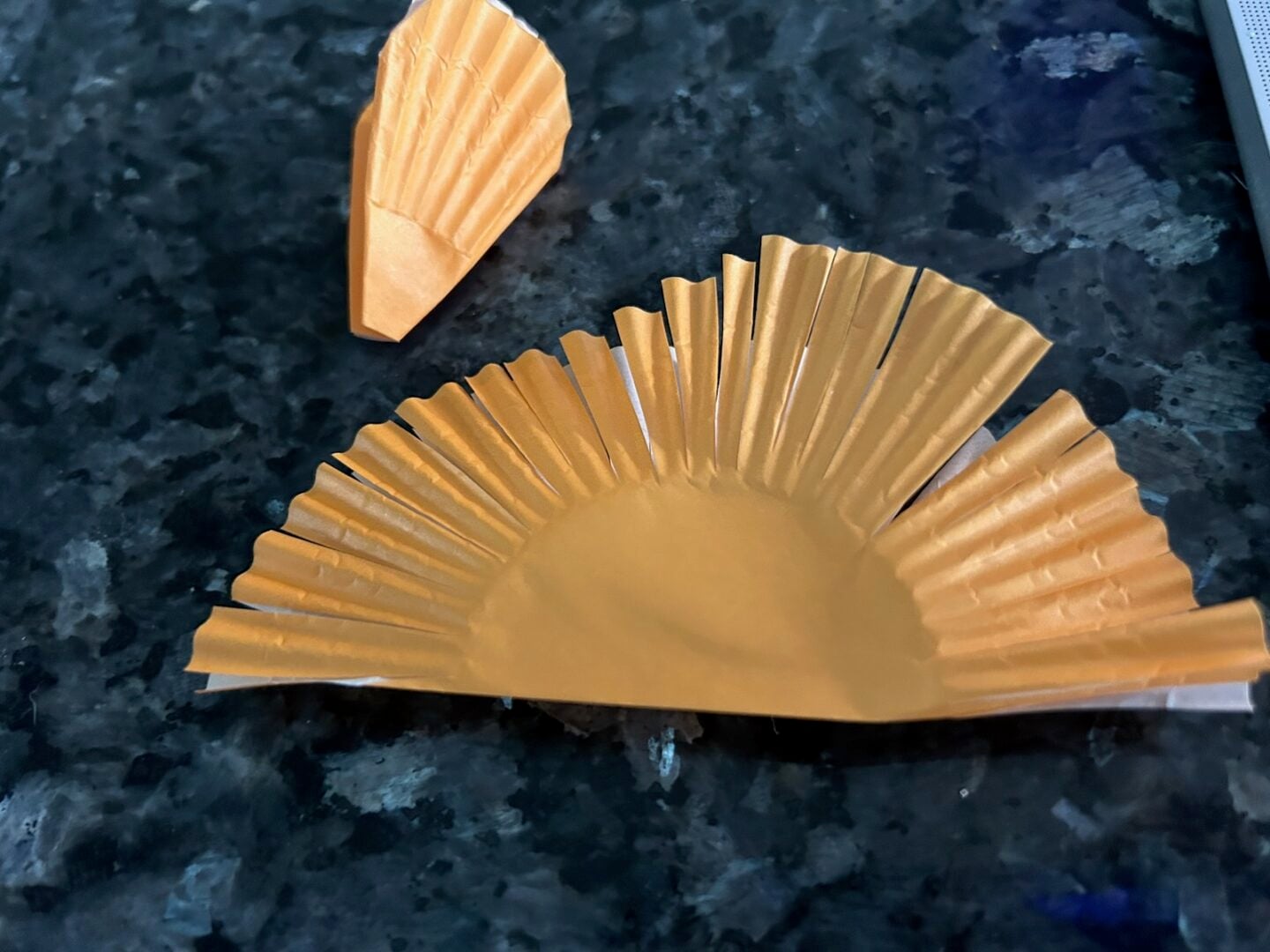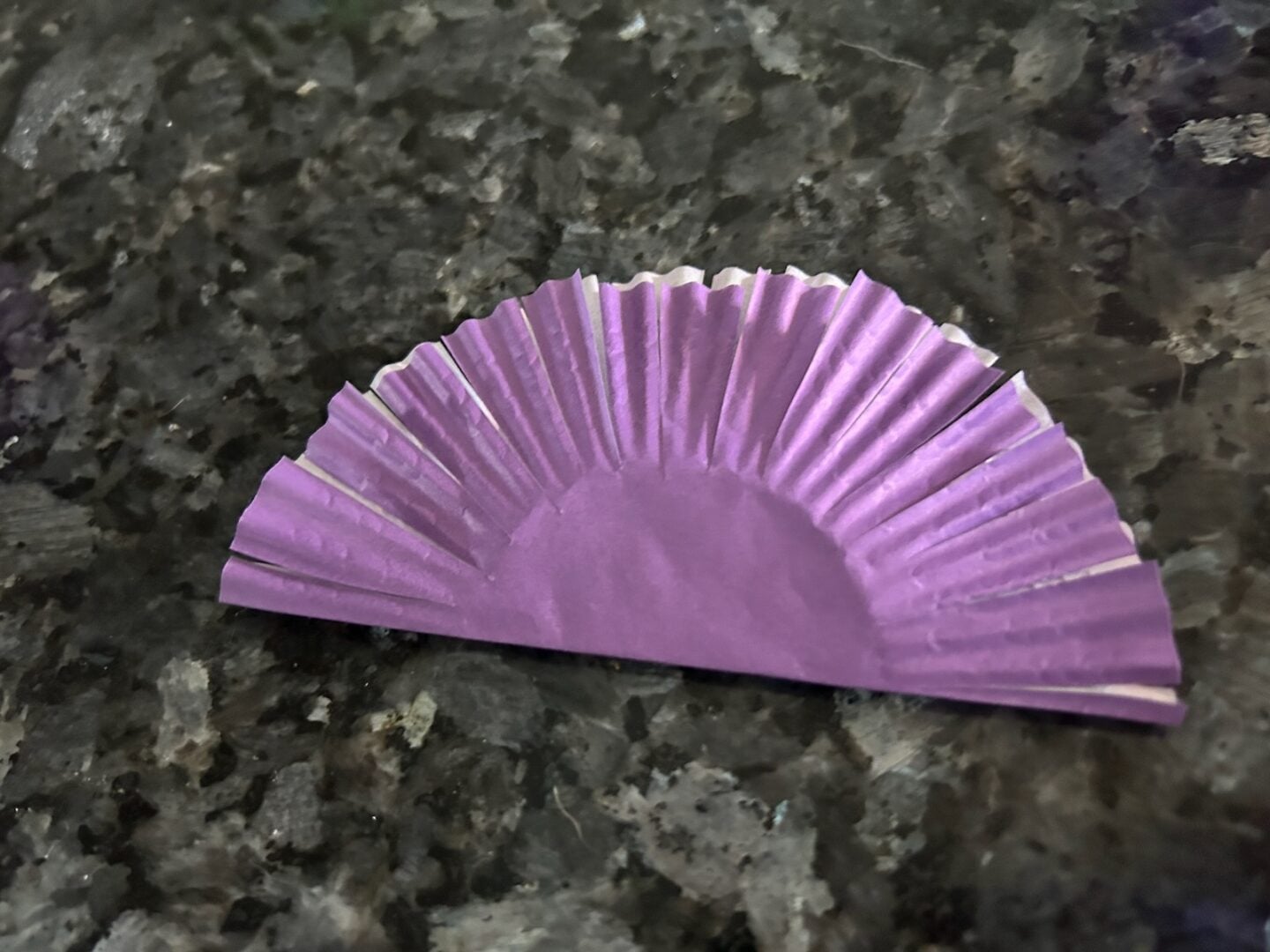 Flatten a cupcake liner and gently press it open. Fold it in half (inner side touching inner side). Now fold it again, this time into a triangle. Now fold it once more, making an even smaller triangle.