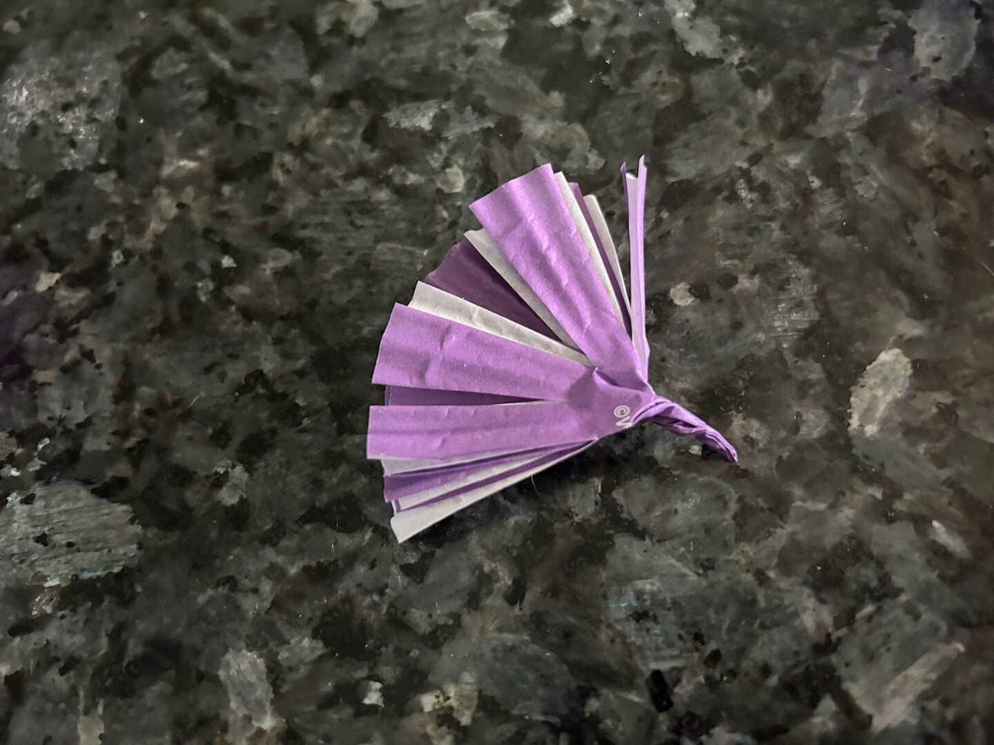 Push the bottom of the fringed piece through the center of your stacked liners. Use a bit of glue to secure everything in place, then glue it into a straw (stem) or to a lollipop stick.