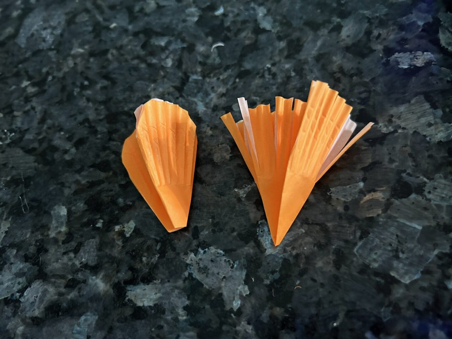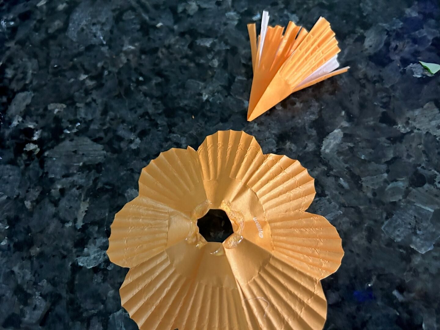 Flatten a cupcake liner and gently press it open. Fold it in half (inner side touching inner side). Now fold it again, this time into a triangle. Now fold it once more, making an even smaller triangle. Now trim the edges into soft petal shapes.