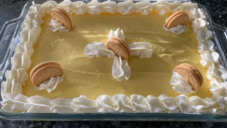 A layered, no-bake dessert with creamy lemon filling and crunchy cookie layers.