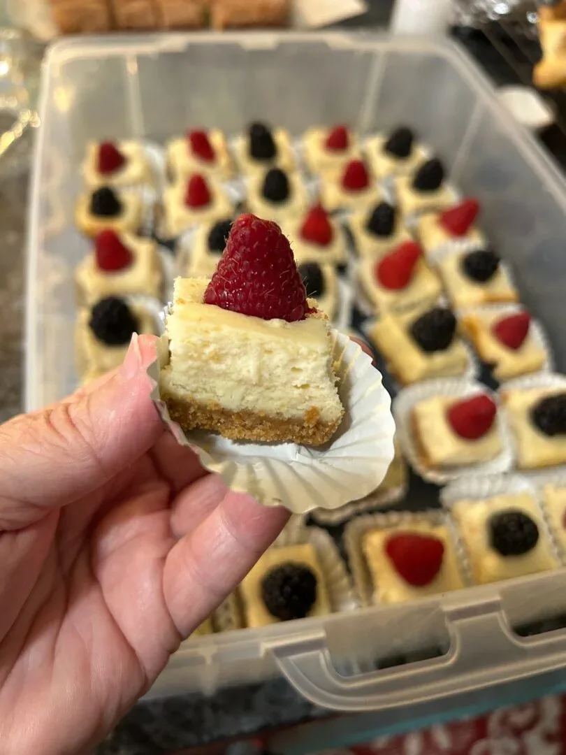 Creamy cheesecake squares with a buttery crust and vibrant raspberry topping.