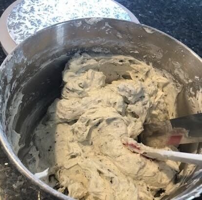 Set aside about a third of the frosting, leaving it pure white for the crumb coat. To the rest, add a cup of crushed Oreos and mix well.