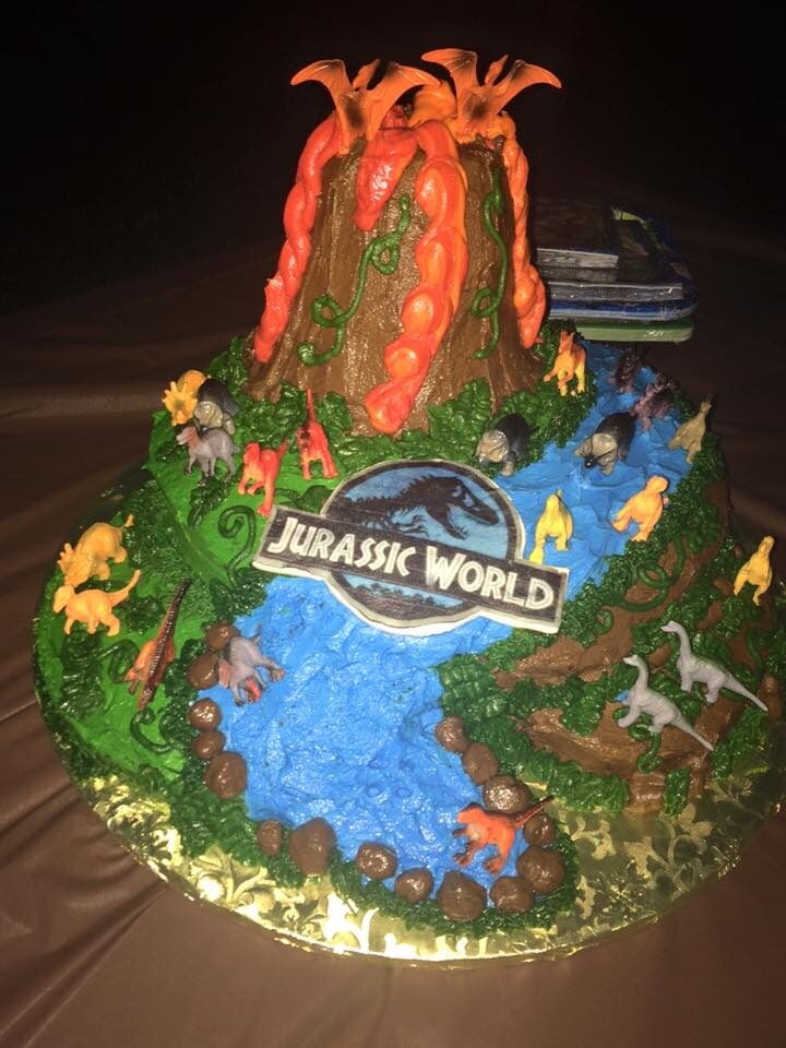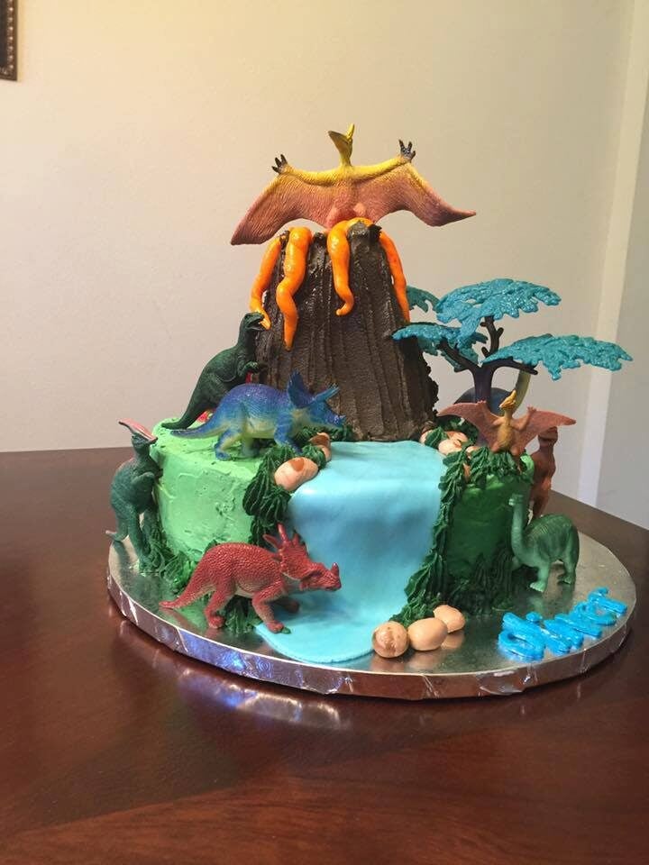 This is one of the easiest themes to bring to life, even with simple decorating skills. Crushed cookies make perfect “dirt,” green frosting becomes grass or jungle vines, and plastic dinosaur toys can instantly transform a basic cake into a prehistoric adventure. You can go bold with volcano cakes and dramatic scenes, or keep it simple with dino footprints, spikes, and textured designs.