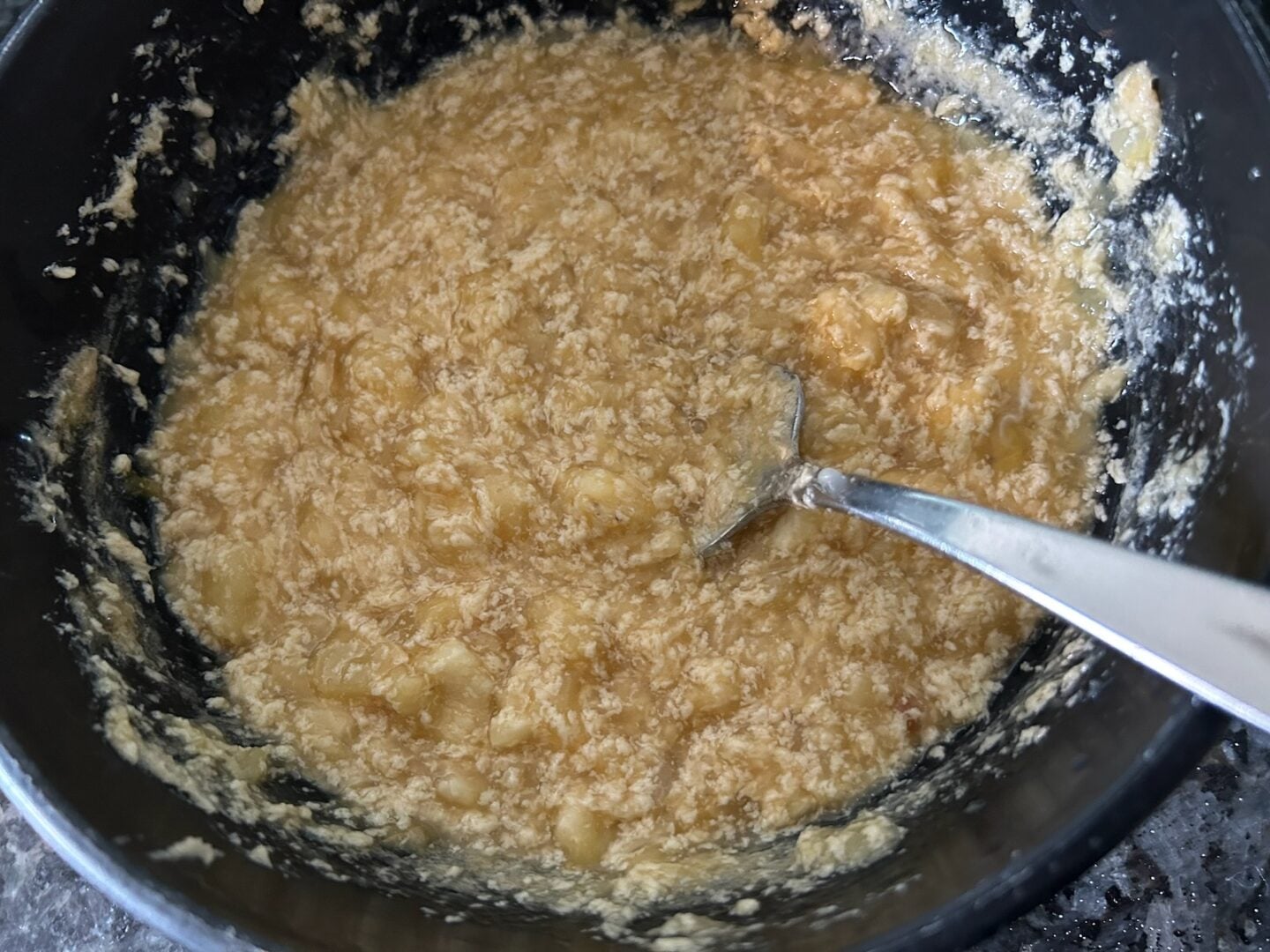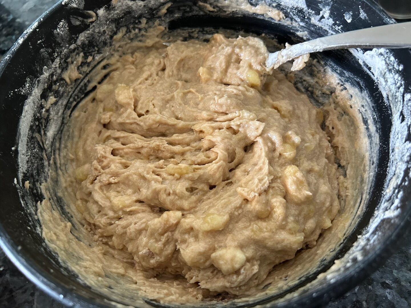Stir in mashed banana and well-drained crushed pineapple. The acids will break the batter, but don't worry! It will all come together.
